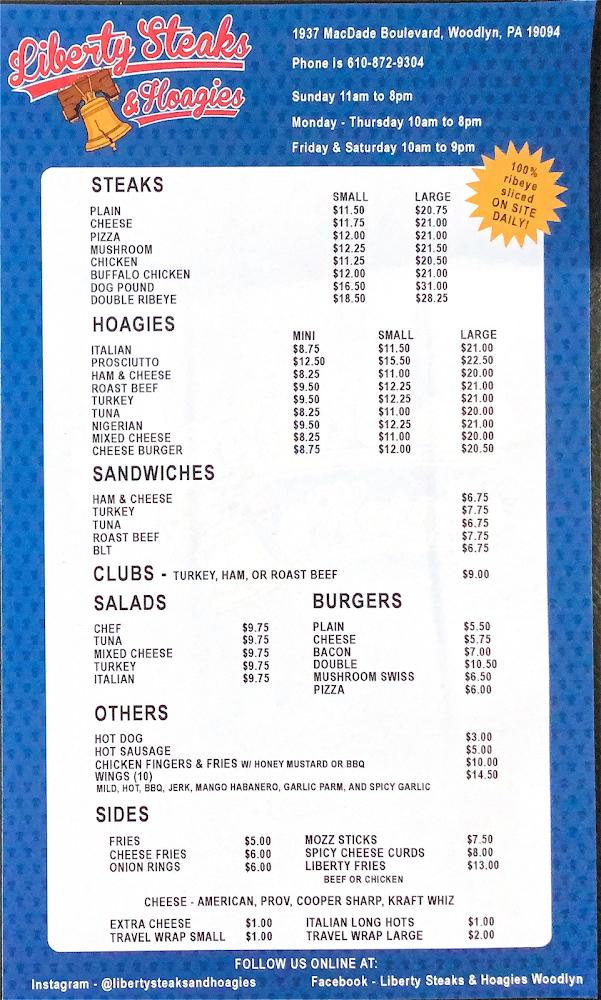 Welcome to Liberty Steaks and Hoagies, your premier destination for authentic Philadelphia cheesesteaks in Woodlyn, PA. Located at 1937 W MacDade Blvd, our vibrant eatery offers a relaxed, trendy atmosphere perfect for everyone—from students to families. Enjoy a diverse menu featuring mouthwatering sandwiches, local specialties, and an extensive selection of beers and cocktails. Whether you're dining in or grabbing takeout, our quick service ensures you won’t wait long for your meal. With accessible seating and amenities, Liberty Steaks and Hoagies is ideal for lunch, dinner, or a solo outing. Join us for great food, live music, and a welcoming vibe!